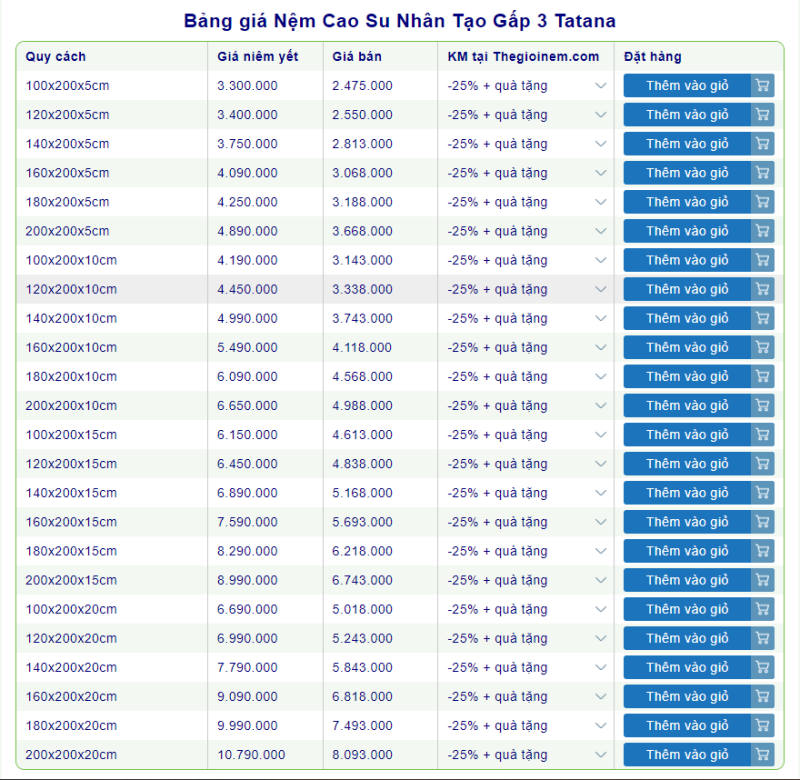 2. Bảng giá các loại nệm cao su nhân tạo