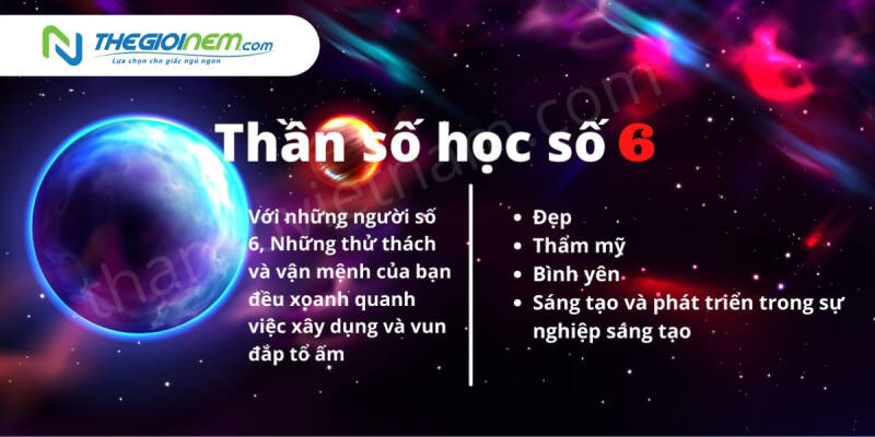 Hầu hết những người thuộc số 6 đều có những khả năng thiên phú trong lĩnh vực sáng tạo. Họ mang trong mình một trọng trách rất lớn vì sự ưu utus có liên quan đến sự sáng tạo và chắc chắn sẽ mang lại thành công to lớn dù là ở đấu trường của quốc tế. Những ngày sinh có số tổng là 15, 24, 33, 42 sẽ được xếp vào những người thuộc con số chủ đạo là số 6.