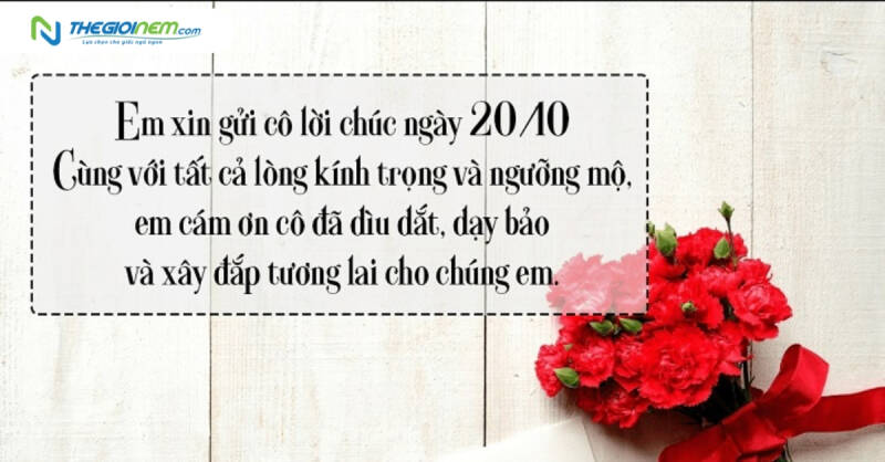 - Cô là người giáo viên xuất sắc và có ảnh hưởng lớn đối với tương lai của chúng tôi. Chúc mừng ngày Phụ Nữ Việt Nam 20/10!